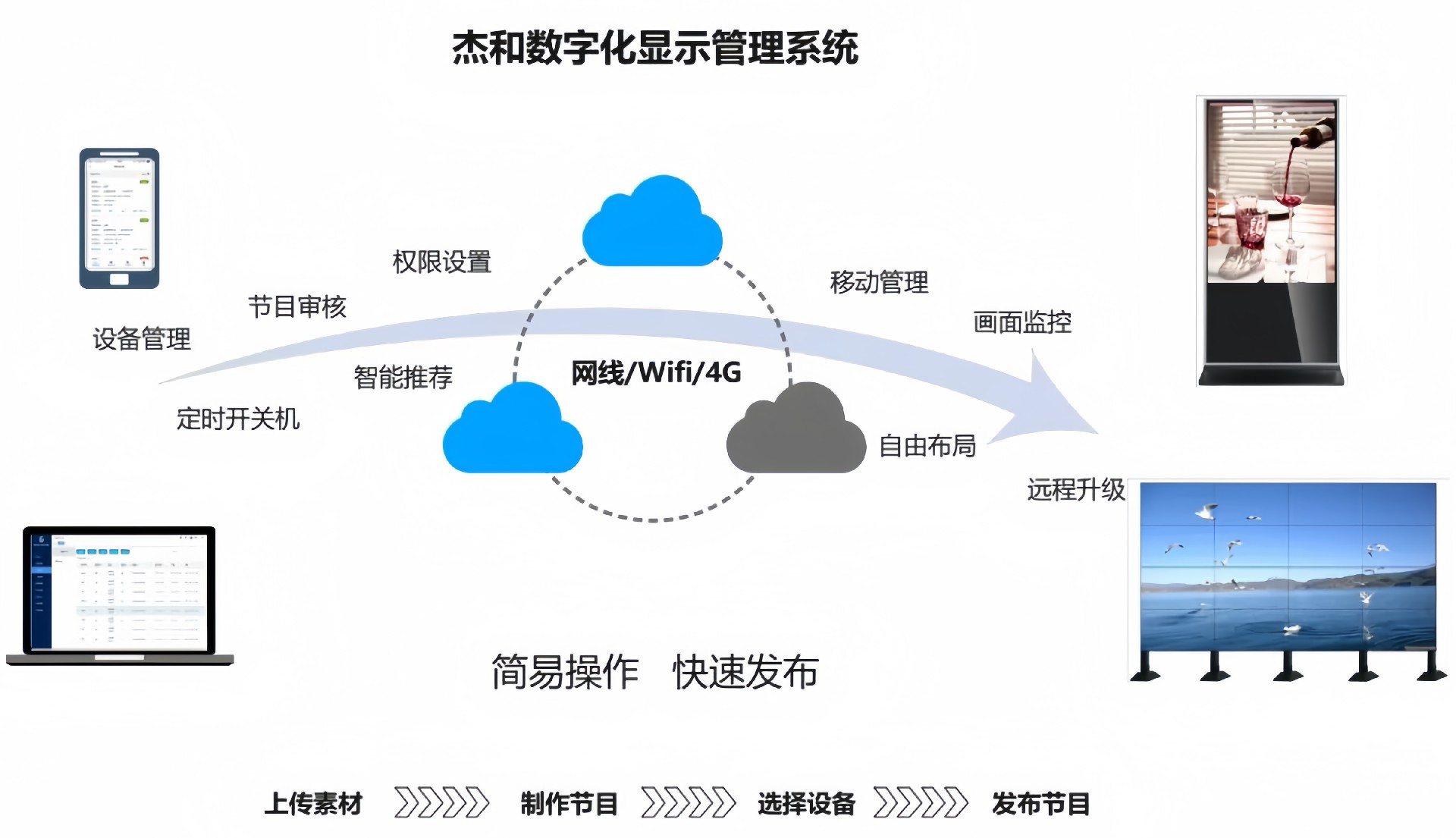 目前博天堂精品(中国)官方科技GDSM-ES系统覆盖市场上多形态网络智能显示终端,满足行业全产品业态需求,如广告机、LED显示屏、LCD拼接屏 、普通液晶电视等各种显示终端,广泛用于广告宣传、通知公告、指示引导。