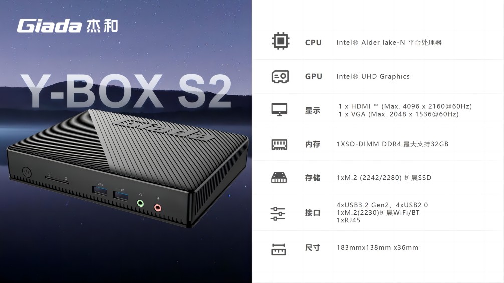 Y-BOX S2处理器平台为Alder Lake-N,是英特尔首款采用7纳米制程的产品系列。采用主流的DDR4内存,支持M.2和eMMC多存储设备可选,M.2支持PCIE X2和SATA SSD,可满足客户对高数据读写的需求,最大支持32GB;具备一个HDMI接口和一个VGA接口,可以连接到显示器、电视及投影仪,HDMI接口支持最高分辨率为4096x2160@60Hz,VGA接口支持最高分辨率为2048x1536@60Hz。