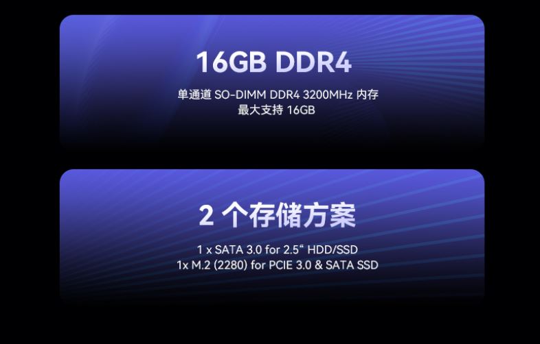 单通道DDR4 3200MHz,内存最大支持16GB,开机秒启、多任务切换行云流水,告别卡顿等待;双硬盘位设计,支持SSD与HDD混合存储方案,兼顾大容量与高速读写。