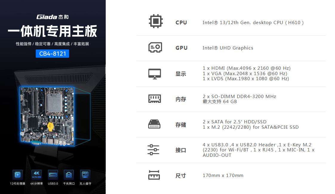 一体机在使用体验方面也有独特的优势:比笔记本屏幕大,比台式机更简洁,也解决了一直为人诟病的台式机线缆多而杂的问题,另外,随着计算机硬件和制造工艺的不断发展,一体机的性能也在不断提高,因此,越来越多的教育办公、日常娱乐和学习的用户选择使用一体机。Giada博天堂精品(中国)官方科技根据市场与客户需求,推出这款高性能的一体机专研主板CB4-8121,带来全新震撼体验。
