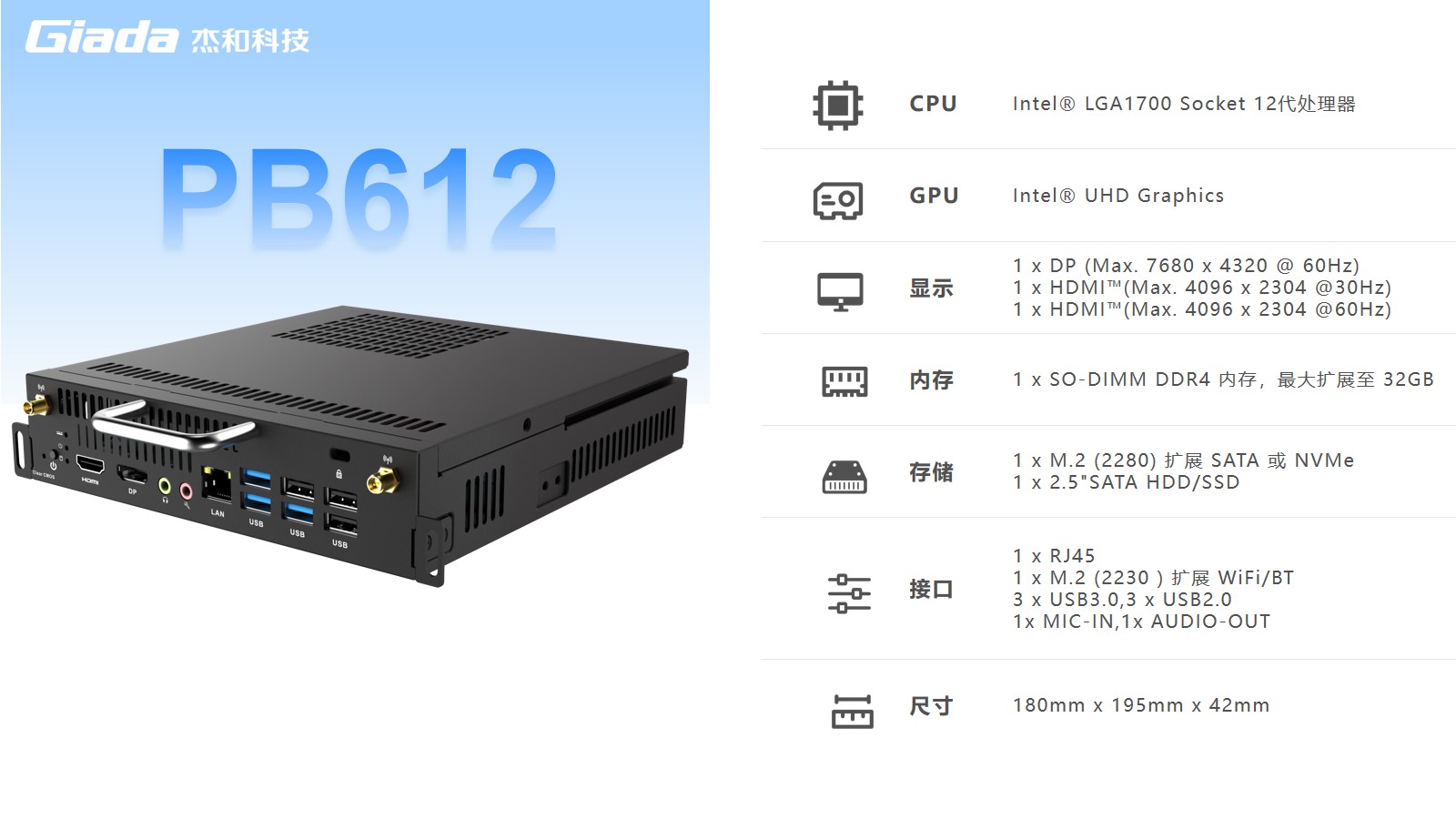 PB612是一种计算模块插件,可用于为平板显示器增加计算能力。PB612采用intel12代Alder Lake-S平台处理器,可以满足更强性能的需求,内存最大可扩容至32GB,更大内存容量及双通道的性能加持,使得PB612可以流畅地打开运行更多的软件,并且可实现8K视频显示,在课堂演示上可提高清晰度和视像传输效率。应用领域包括教育行业中的电子白板、教学交互智能平板、智慧电子黑板以及商业办公中的会议平板/白板等。