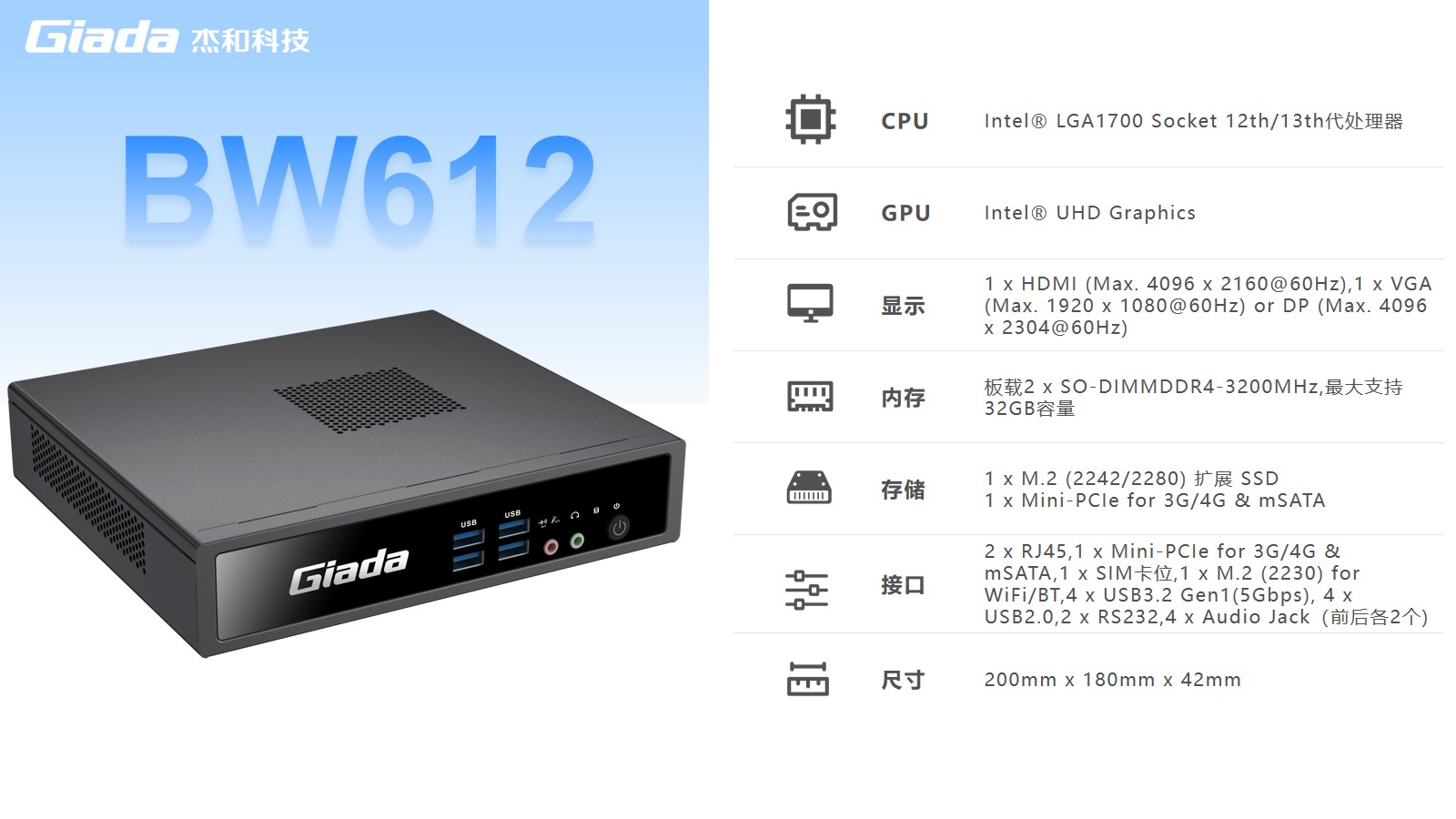 BW612采用lntel@LGA1700Socket 12代、13代处理器,比上一代 BW611计算性能提升约 23%,更强算力带来更强体验。主板多层板设计,配备超高品质被动元件,支持赛扬、奔腾等多种处理器定制,可选择 Windows7、Windows10 等操作系统。具备便捷管理部署、性能强悍、扩展性强、安全性高等优势,使用Intel UHD Graphics,支持高达4K@60Hz的分辨率双屏输出。可实现拓展、复制、独显模式的自由选择,享受清晰细腻的画面效果的同时实现高效的多任务处理,为使用者提供高清流畅的桌面体验。